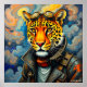 Eine fantastische Leopardenfigur ist mit Steampunkaccessoires, darunter eine Brille und eine aufwändige Rüstung, geschmückt. Der lebendige dynamische Hintergrund schafft eine skurrile und abenteuerliche Atmosphäre.