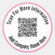In der Mitte des Aufklebers befindet sich ein Anzeigebild. Sie können es durch Ihren QR-Code ersetzen. Es gibt zwei Zeilen schwarzen Anzeigetextes, die Sie bearbeiten können, um eine benutzerdefinierte Nachricht zu zeigen. Diese Aufkleber haben schwarzen Text in einem weißen Kreis. Der Aufkleber hat einen rosa Rand.