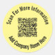 Ein Anzeigebild befindet sich in der Mitte des Aufklebers. Sie können es durch Ihren QR-Code ersetzen. Es gibt zwei Zeilen schwarzen Anzeigetextes, die Sie bearbeiten können, um Ihre benutzerdefinierte Nachricht zu zeigen. (Angezeigt: Nach weiteren Informationen suchen Hier Firmenname hinzufügen) Der Aufkleber ist hellgelb.