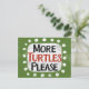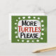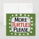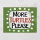 "Mehr Schildkröten bitte" ist ein niedliches Textdesign in grün mit schwarzem und rotem Text, zusammen mit einer weißen Akzent-Form und weißen texturierten weißen, weißgetönten weißen Punkten, die ihn umgeben.