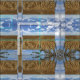 Zwei Fotografien, die während der Weizenernte genommen wurden, kombinierten zusammen, um ein interessantes ungewöhnliches natürliches Blockmuster für Gewebe zu machen. Vervollkommnen Sie für Kissen und Wohngestaltungprojekte. Das Weiß bewölkt sich gegen das Spiel des blauen Himmels weg von den linearen Mustern der gelben und braunen Weizenreihen.