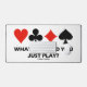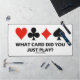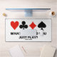 Wenn Sie mit einem schnellen Kartenspielpartner spielen, genießen Sie diese wry-bridge-Sprichwort-Tischmatte mit den vier Karten-Anzügen, zusammen mit der oft hörbaren Bemerkung am Bridge-Tisch: "Welche Karte hast du gerade gespielt?" Mit dieser Bridge-Abfrage-Matte können Sie das nächste Mal Bridge online spielen! Perfekte Schreibtischmatte für jeden Bridge-Player mit einem wirklich kurzen Speicher!