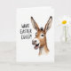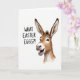 Dieses Design zeigt einen stilisierten, pferdeähnlichen Kopf, der in losen Wasserfarben mit scharfen Tintenlinien gemalt ist und vor einem schlichten weißen Hintergrund platziert wurde. Der Charakter ist nach links gewandt und in warmen Brauntönen und weichen Grautönen gehalten, mit hohen, aufmerksamen Ohren und dunklen, ausdrucksstarken Augen, die von langen Wimpern umrahmt sind und wie ein neckischer Blick auf jemanden wirken, der gerade außerhalb der Seite steht. Ein breites Grinsen zieht sich über seine Schnauze, zeigt eine hellrosa Zunge und scharfe, vereinfachte Zähne, als ob es einen privaten Witz mit einem Freund teilt. Links neben dem Gesicht fragt eine große, handgeschriebene Schrift: „WAS FÜR OSTER EIER?!“, wobei der Text in dunkler Tinte stark auf dem weißen Raum hervorsticht. Die Anordnung lässt viel offenen Raum zwischen den Wörtern und dem Charakter, was der Frage das Gefühl eines spielerischen Wechselspiels gibt. Ein kleines 🌷-Detail kann nahe dem Text hinzugefügt werden, um das saisonale