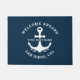 El diseño náutico de la alfombra náutica "Welcome Aboard" presenta un diseño sencillo y elegante de estilo costero blanco y azul marino con acento de ancla. Personalice el texto del personalizado con el nombre de su barco junto con su ubicación, ciudad y estado. Es un gran regalo para los propietarios de botes con temática náutica.