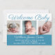 Willkommen, Baby. Eine klassische Kindergeburtsankündigung in krautblauer Foto mit wunderschöner kursiver Typografie über Ihrer süßen Fotocollage. Passen Sie die Rückseite mit Ihrem Lieblings-Foto Ihres neuen Säuglings für eine schöne Karte an.