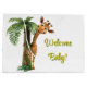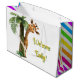 Eine farbenfrohe große Geschenktasche mit einem Cartoon-Baby-Giraffe und Begrüßungsbaby für Babydusche oder Neugeborene
