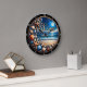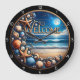This beautiful beach-themed clock features a moonlit ocean scene with waves crashing on a sandy shore. Numerous seashells and starfish in various colors are arranged around the border, with the word "WELCOME" prominently displayed in the center. The clock has a black outer rim with white numbers 1-12.