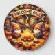 Diese festliche Uhr zeigt zwei skurrile Zwerge in farbenfrohen, gestreiften Hüten, die an einem zerreißenden Lagerfeuer sitzen. Sie sind von Kürbissen, Holzfässern und herbstlichen Blättern umgeben, die auf einem Holzfußboden fallen. Ein Banner am oberen Ende der Uhr lautet "WELCOME FALL". Die Uhrenhänder sind schwarz und das Design wird durch einen goldfarbenen Rahmen mit Herbstblättern und Beeren gerahmt.