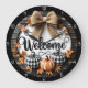 This charming autumn-themed clock features a large tan bow at the top, and "Welcome" in a flowing script in the center. Below are three pumpkins, one orange and two plaid, surrounded by fall leaves, all set against a rustic wood plank background. The clock has a black outer rim with white numbers 1-12.