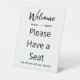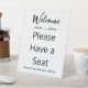 This business sign says Welcome Please Have a Seat We will be with you shortly. All text is white and can be edited. Welcome is in an elegant script. The sign is white. A decorative line is under welcome.