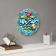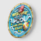 Diese runde Wanduhr zeigt eine lebendige Poolszene im 3D-Stil mit einem roten Liegestuhl und einer bunten Beachkugel. Die Worte "WILLKOMMEN ZU UNSEREM POOL" werden in fett gelben Buchstaben hervorgehoben dargestellt, zusammen mit "KOMMEN, SCHWIMMEN, ENTSPANNEN!". Der Hintergrund ist mit weißem Wasser und subtilen weißen Wellenmustern, die alle in einem glänzenden, goldfarbenen Rahmen eingefasst sind.