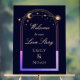 Welcome To Our Love Story Navy Blue Celestial Wedding Welcome Sign Celestial Cosmic Galaxy Space Acrylic Wedding Welcome Sign features a rainbow sun, moon and stars frame on a dark navy blue background. Inside the frame features the text "Welcome to our love story" with your names below in elegant peach calligraphy script. Designed for you by ©2024 Evco Studio www.zazzle.com/store/evcostudio