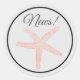 Dieser kleine, runde Aufkleber-Umschlag Aufkleber ist so konzipiert, dass er mit der "Welcome Wee Baby"-Geburtshilfekarte und dem in diesem Laden erhältlichen Umschlag übereinstimmt. Es hat den blass-grauen passenden Schriftart wie die Ankündigung, sowie eine pastellrosa Seesternillustrierung, die alle mit einem dünnen, runden schwarzen Rahmen umgeben ist.