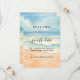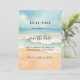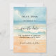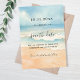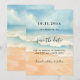 Ein Strand mit feinem Sand, Meereswellen und blauer Himmel als Hintergrund. Personalisieren und fügen Sie ein Datum und Ihre Namen. Der Text: Save the Date ist mit einem großen angesagten, handgeschriebenen Stilskript geschrieben.