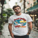 Ein niedlicher und kluger Bulldog ist ein idealer Ort, um auf einer großen Welle auf einer tropischen Insel zu surfen.