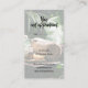 Eine stilvolle Wellness-Center-Visitenkarte mit durchsichtigem, weißem Rahmen auf der Vorderseite und weiteren Details auf der Rückseite bietet ein Design aus Blume, Blätter, Öl und Handtüchern. Personalisieren Sie diese Visitenkarte, um einzigartig Ihre zu sein.