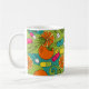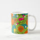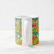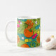Elevate your daily coffee or tea ritual with this uniquely designed ceramic mug. Featuring a playful, modern illustration, this eye-catching pattern celebrates health and vitality. The design showcases juicy orange citrus slices and whole fruits intertwined with a colorful array of vitamin capsules and supplements, set against a backdrop of lush green vines and swirling teal shapes.
