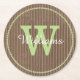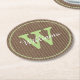 Die stilvollen Massenbrettpapier-Untersetzer, die in einer braunen Wellpappe getan werden, schauen, mit Grafiken eines hellgrünen punktierten Kreises um den äußeren Rand. Personifizieren Sie das große hellgrüne Buchstabemonogramm und weißen den Skripttext zum Anzug Ihr Bedarf. Groß für jederzeit verwenden Sie und macht eine nette Geschenkidee.