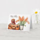 Wasserfarbener niedlicher Welpe mit warmem Schal sitzend auf einem alten Koffer mit Herbst-Blume.