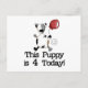 Ein niedliches Welpe 4. Geburtstag Design auf Welpe 4. Geburtstag T - Shirt, Tasse, Karten, Aufkleber, und mehr mit Welpen, Rotgeburtballon, und Text, der lautet: "Dieses Welpe ist heute 4!".