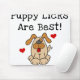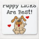 Ein niedlicher brauner Hund mit seiner kleinen Zunge, die heraus hängen, roten Herzen und schwarzem Text, der "Welpen liest, leckt sind am besten!".