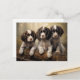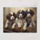 Das Bild zeigt drei bezaubernde englische Springer Spaniel-Welpen, die auf einem gefallenen Login in einer Waldlandschaft sitzen. Die Welpen sind alle weiß mit braunen Markierungen, und sie haben große, ausdrucksstarke Augen. Der Hintergrund ist ein weiches, verschwommenes Bild eines Waldes, mit gedämpftem Sonnenlicht, das durch die Bäume gefiltert wird. Perfektes Geschenk für Springer Spaniel Liebhaber.