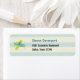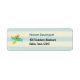 Adressetiketten mit einer niedlichen kindlichen thematischen Kunst-Illustration eines kleinen Hundelfahrens in einem Spielzeugflugzeug. Set auf cremefarbenem, blau gestreiften Hintergrund.