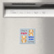 Dies ist ein niedlicher Kühlschrank-Magnet, der auch für geschäftige Haushalte praktisch ist! Im Text steht: "Hund ist Gefüttert! Hund ist nicht Gefüttert!" in Grau, Rot und Blau, und mit einem niedlichen kleinen braunen und weißen Hundehund Cartoon Bild. Die Bilder und der Text werden auf einem hellblauen grauen Hintergrund platziert.