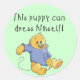 Ein bezaubernder Welpe legt ein blaues Shirt an und Text lautet: "Dieser Welpe kann sich selber verkleiden!". Es ist ein tolles Design für Kleinkinder, die einfach lernen, sich selbst zu kleiden!