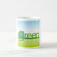 Ein Globus im Wort Grün bildet die Welt der grünen Erde. Dieses Design sieht auf dieser Tasse wirklich effektiv aus