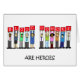 Eine Gruppe von Cartoon unterschiedlicher ethnischer Herkunft, die in einer Reihe stehend sind. Sie halten rote quadratische Karten auf, die weiße Buchstaben auf dem Zauber 'Blutspender' haben. Unter dem Bild sind die Worte "Sind Helden".