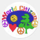Ein buntes Regenbogendesign aus Friedenssymbolen, um gegen Krieg zu protestieren, ein Baum und eine Sonne, um die Ressourcen des Planeten zu retten, und ein Herz, um sich gegenseitig in den Krawatte zu Liebe zu bringen, mit den Worten: "Weltbürger".