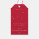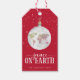 Weltfrieden Aquarell Welt Ornament, klassische Weihnachts-Rot-Feiertage Geschenk Tags. Karteneigenschaften, schneeabnehmende Akzente, Aquarellverzierungen und festliche Schrift. Template enthält Textzeilen für Ihren Familiennamen vorne mit Zeilen für Ihre Nachricht, Namen und Jahr auf der Rückseite