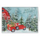 Die Vorderseite dieser Holiday Grußkarte ist ein impressionistisches Bild einer winterlichen Landwaldszene, mit einer roten Scheune, schneebedeckten Kiefern und einem LKW gefüllt mit Weihnachtsgoodies. Der rote LKW ist im Schnee geparkt und Schneeflocken treiben um ihn herum. Im Text oben steht "Weltfrieden". Die Innenseite der Karte verfügt über vier Textfelder, die Sie anpassen können.