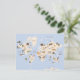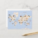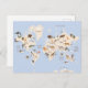 Weltkarte mit Tieren Postkarte. Alle 7 Kontinente auf einem sanften Pastellblau.
