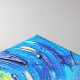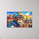 Dieses lebendige Kunstwerk präsentiert eine fesselnde Nahaufnahme des Gesichts eines Hundes, gerahmt innerhalb des klaren Visors eines Astronautenhelms. Mit kühnen, texturierten Pinselstrichen in einer dynamischen Palette aus Orangen-, Blau- und Rottönen trifft der ausdrucksstarke Blick des Hundes den Betrachter. Der Hintergrund entfaltet sich zu einer stilisierten kosmischen Weite mit entfernten Planeten und verstreuten nebelartigen Formationen, alle mit einem taktilen, fast impasto-artigen Effekt dargestellt. Die detaillierte Darstellung des Fells und des Helms kontrastiert mit den energiegeladenen, abstrakten Elementen des umgebenden Raums und schafft eine auffallende visuelle Erzählung.