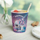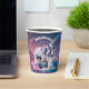 Eine Papiertasse für eine Babydusche im Weltraum, die mit blauen und rosa Ballons dekoriert ist und für alle Geschlechter geeignet ist