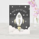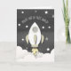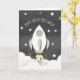 Illustration eines Raketenschiffs mit Wolken und Sternen über einem grauen Aquarell inspiriert Hintergrund mit "You're Out Of This World" Text.