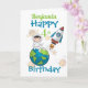 Eine lustige Raumdesign-Karte für einen 4. Geburtstag mit einem Astronauten, der auf der Welt sitzt, einer Raumrakete in der Nähe und einem Hintergrund von Planeten und Sternschüssen. Ein tolles Design für die kleinen Jungs, die vier Jahre alt sein werden. Kann personalisiert werden, indem Sie den Namen und das Alter ändern und dann Ihre eigene Nachricht hineinfügen. Eine Geburtstagskarte für einen Enkel oder Neffen.