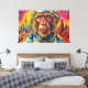 Dieses lebendige Kunstwerk präsentiert eine fesselnde Nahaufnahme des Gesichts eines Hundes, gerahmt innerhalb des klaren Visors eines Astronautenhelms. Mit kühnen, texturierten Pinselstrichen in einer dynamischen Palette aus Oranges, Blauen und Rot dargestellt, trifft der ausdrucksstarke Blick des Hundes den Betrachter. Der Hintergrund entfaltet sich zu einer stilisierten kosmischen Weite mit entfernten Planeten und verstreuten nebelartigen Formationen, alle mit einem taktilen, fast impasto-artigen Effekt dargestellt. Die detaillierte Darstellung des Fells und des Helms kontrastiert mit den energiegeladenen, abstrakten Elementen des umgebenden Raums und schafft eine auffallende visuelle Erzählung.