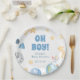 Baby Shower Party Supplies mit "oh boy!", Veranstaltungsname und Datum gerahmt durch Aquarellbilder von Sternen, Planeten und Raketen. Koordiniert mit der Out of the World Kollektion im Adore Paper Co. Zazzle Shop.