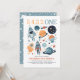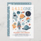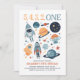 Einfache und moderne Weltraum Einladung zum 1. Geburtstag mit dem Countdown "5, 4, 3, 2, one" in niedlichem hellblau und orange Schriftart. Es zeigt Planeten, Raketenschiffe, Astronauten und Sternenbilder.