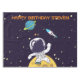 Tischdecken zum Geburtstag mit dunkelblauem Hintergrund mit gelben Sternen verstreut. Obergeschichtet ist eine Abbildung eines Raumfahrers, der einen Anzug des Astronauten trägt, der über dem Mond schweben lässt. In der Ferne ist ein Planet mit Ringen und einem Raketenschiff, das in den Himmel fliegt und nach neuen Welten sucht, die es zu erforschen gilt.