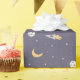 Raumverpackungspapier mit Himmelsmuster mit Raumschiffen, Planeten, Monden und Sternen am dunkelblauen Himmel.