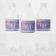 Elegante Wasserflaschen-Etiketten mit anpassbarem Monogramm vor einem galaxischen Hintergrund.