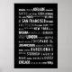 Schwarzweiß-Poster mit Namen berühmter Weltstädte.