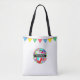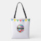 Welttournee und bunte Fahnen auf der weißen Tote Tasche.