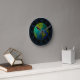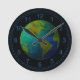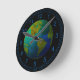 Diese Grafik eines Globus ist in Blues, Grüntönen und Set vor einem schwarzen Hintergrund. Das Uhrengesicht ist im selben Blau wie das Wasser der Erde.