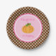 Kurieren Sie wenig Geburtstags-Party-Papier-Teller des Kürbises themed. Ein süßer Entwurf perfekt für ein Fallgeburtstags-Party für Ihr kleines Mädchen. Girly Farben von Orange, von rosa und von Braunem.