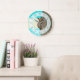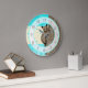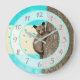 Kleines BabyBärenjunges, das einen Baum in den aquamarinen und tan Kindern oder in der Baby-Kinderzimmeruhr klettert.